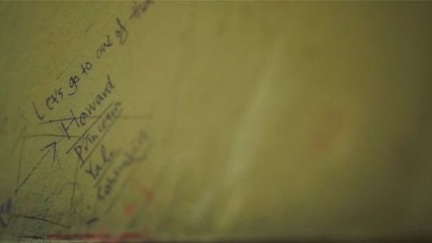 موقع بیرون آمدن از دکساشیل چشمم به دستخط یکی از بچهها روی دیوار میافتد که زیر نور لرزان لامپ مهتابی معیوب آدم را یاد دست خط زندانیها روی دیوار میاندازد. به انگلیسی نوشته: “بیا به یکی از این دانشگاهها برویم: هاروارد، پرینستون، ییل، کلمبیا”.